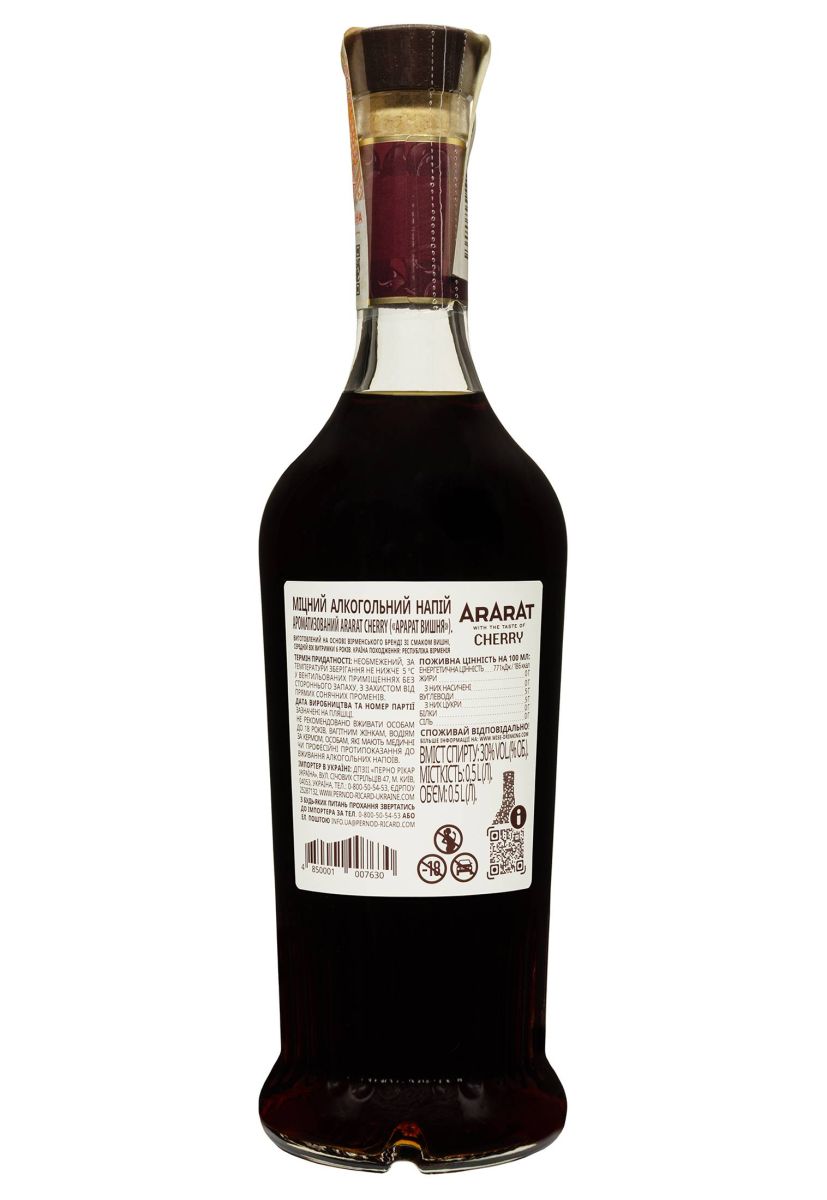 Бренди Ararat Cherry 0.5 л — это уникальный крепкий напиток от Ереванского Коньячного Завода, основанного в 1887 году Нерсесом Таиряном. Создан на основе коньячных спиртов шестилетней выдержки с добавлением натурального экстракта спелой вишни, собранной в Араратской долине. Этот напиток сочетает традиции армянского коньячного мастерства с сочным вишнёвым ароматом, создавая гармоничный и утончённый вкус. С 1998 года завод входит в состав группы Pernod Ricard, что гарантирует мировые стандарты качества. Ararat Cherry — идеальный выбор для дижестива, коктейлей или стильного подарка 🎁, вдохновлённого солнечной Арменией.