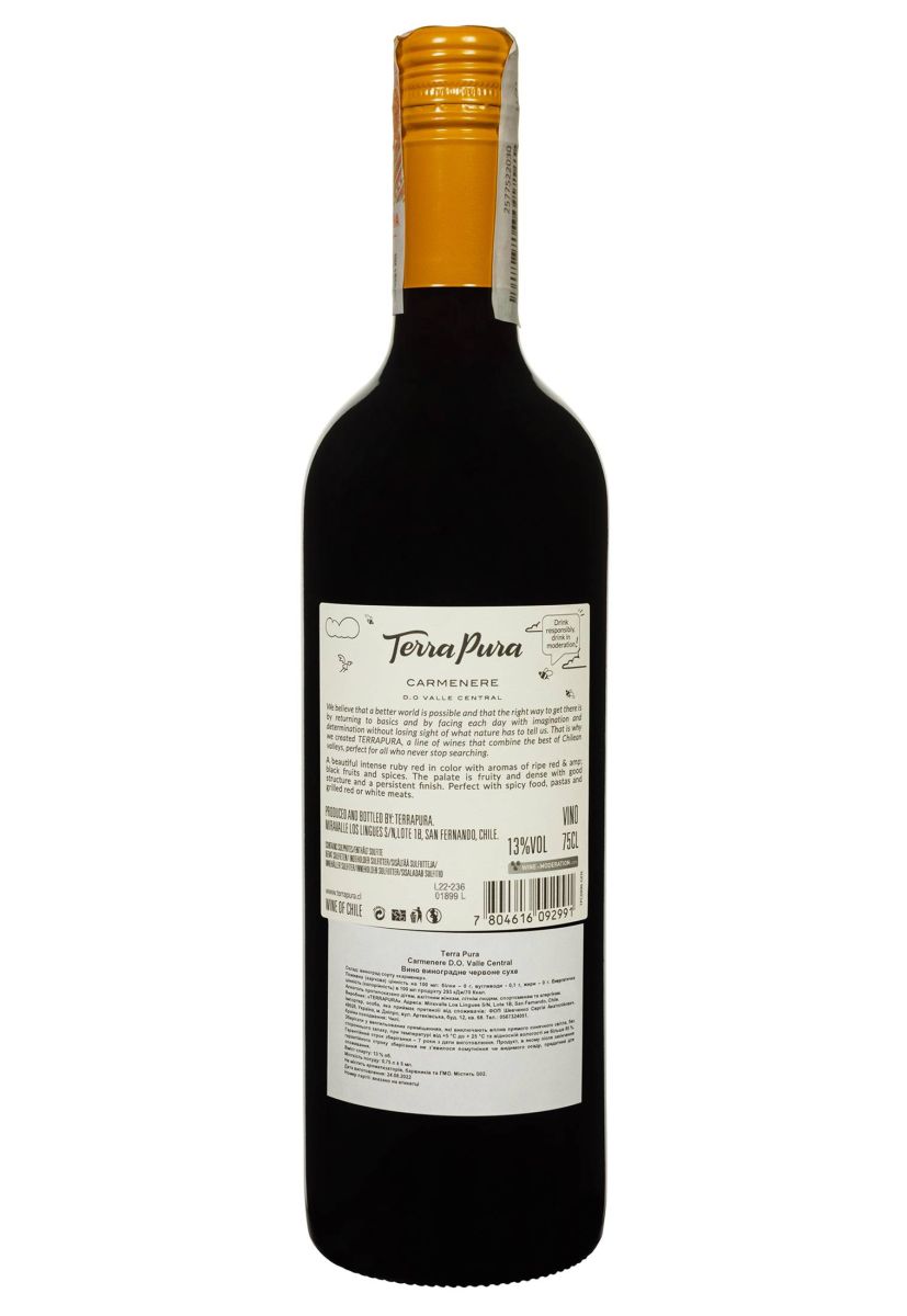 🔸 Особенности производства: Виноград Карменере собирается вручную в марте–апреле, когда ягоды достигают оптимальной зрелости на вулканических почвах Центральной Долины. После дестемминга и мягкого прессования следует алкогольная ферментация при контролируемой температуре 25–28°C в течение 10–14 дней с мацерацией на кожице для извлечения цвета и танинов. Малолактичная ферментация смягчает структуру, а выдержка в стальных чанах (6–8 месяцев) с периодическим батоннажем сохраняет свежесть без влияния дуба. Минимальная фильтрация подчеркивает природный характер. Цвет — глубокий рубиновый с фиолетовыми оттенками, отражающий андский терруар. Terra Pura фокусируется на устойчивом земледелии, производя вино для массового рынка, но с премиум-качеством, популярным в Европе, Азии и Америке, с наградами на международных конкурсах за аутентичность и баланс.