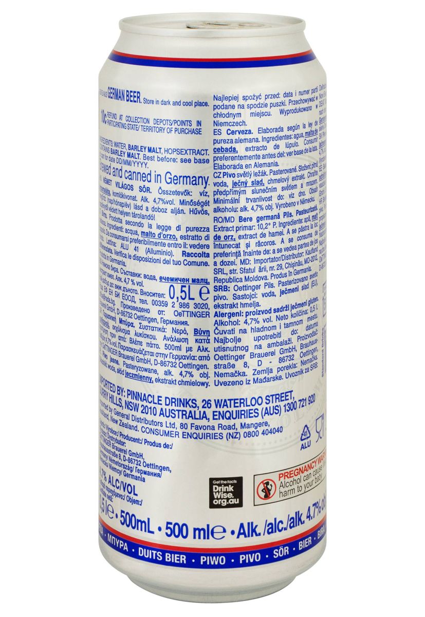 Пиво Oettinger Pils світле ж/б 0.5 л 4.7% — це культовий німецький світлий лагер у стилі German Pilsener, який виготовляється пивоварнею Oettinger, заснованою в 1731 році в баварському містечку Еттінген. Компанія, що починалася як сімейне підприємство під назвою «Furstliche Brauhaus zu Oettingen», сьогодні є лідером німецького ринку завдяки поєднанню високої якості та доступної ціни. Oettinger Pils вариться в суворій відповідності до закону про чистоту пива (Райнхайтсгебот) 1516 року, використовуючи лише воду, ячмінний солод, хміль і дріжджі. Подвійна ферментація та витримка забезпечують напою світло-золотистий колір, стійку піну та свіжий смак. Пиво здобуло популярність у Німеччині та експортується до 100 країн, зокрема до Австралії, де воно лідирує серед німецьких брендів. Зручна жерстяна банка 0.5 л робить його ідеальним для пікніків, вечірок або домашнього відпочинку. Напій отримав срібну медаль на Міжнародному форумі «Пиво» в Сочі (2009) та високу оцінку журналу Beers of the World (2012).