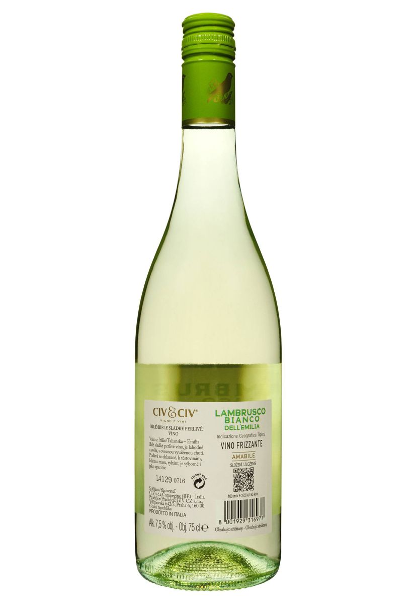 Civ&Civ Lambrusco dell'Emilia Bianco Amabile — это полусладкое белое ламбруско от знаменитой кооперативной винодельни Cantine Civ&Civ (Cantine Cooperative Riunite & Civ), крупнейшего производителя ламбруско в мире. Создаётся из белых сортов ламбруско (Salamino, Sorbara, Grasaparossa), выращенных в регионе Эмилия-Романья. Метод Шарма с искусственным насыщением углекислым газом дарит вину мягкую игристость и низкий алкоголь — всего 8%! Amabile означает «милый, нежный» — идеальное описание этого вина: сладковатое, ароматное и невероятно лёгкое. Это ламбруско для девушек, романтических вечеров, девичников и милых подарков 🎁.