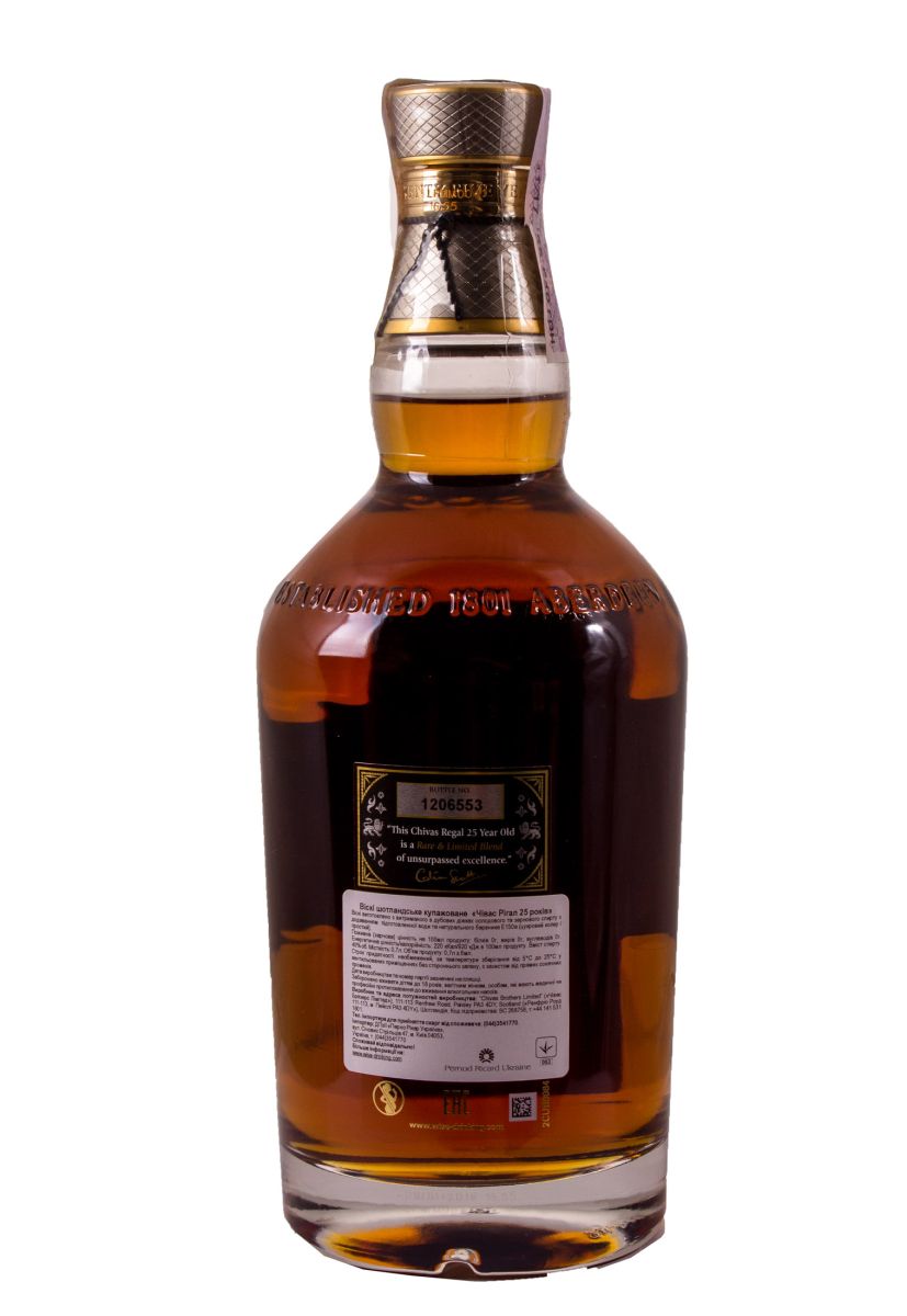 Chivas Regal 25 Y.O. — это легендарный купажированный шотландский виски премиум-класса, созданный в 1909 году компанией Chivas Brothers и возрождённый в 2007 году мастером купажирования Колином Скоттом. Этот виски, выдержанный минимум 25 лет, считается эталоном люксовых напитков и одним из величайших творений Шотландии. Производится в регионе Спейсайд, с сердцем купажа — односолодовым виски Strathisla, созданным на старейшей винокурне Шотландии (основана в 1786 году). Спирты выдерживаются в дубовых бочках из-под бурбона и хереса, что придаёт напитку богатый и сложный вкус. Бренд, принадлежащий Pernod Ricard с 2000 года, завоевал мировую славу, продавая 3–4 миллиона ящиков ежегодно, а Chivas Regal 25 Y.O. получил золотую медаль на IWSC 2014 как лучший купажированный виски. Элегантная бутылка с филигранным орнаментом, восковой печатью и напылением из серебра и золота упакована в роскошный подарочный кейс, что делает её идеальным выбором для коллекционеров, ценителей и статусных подарков.