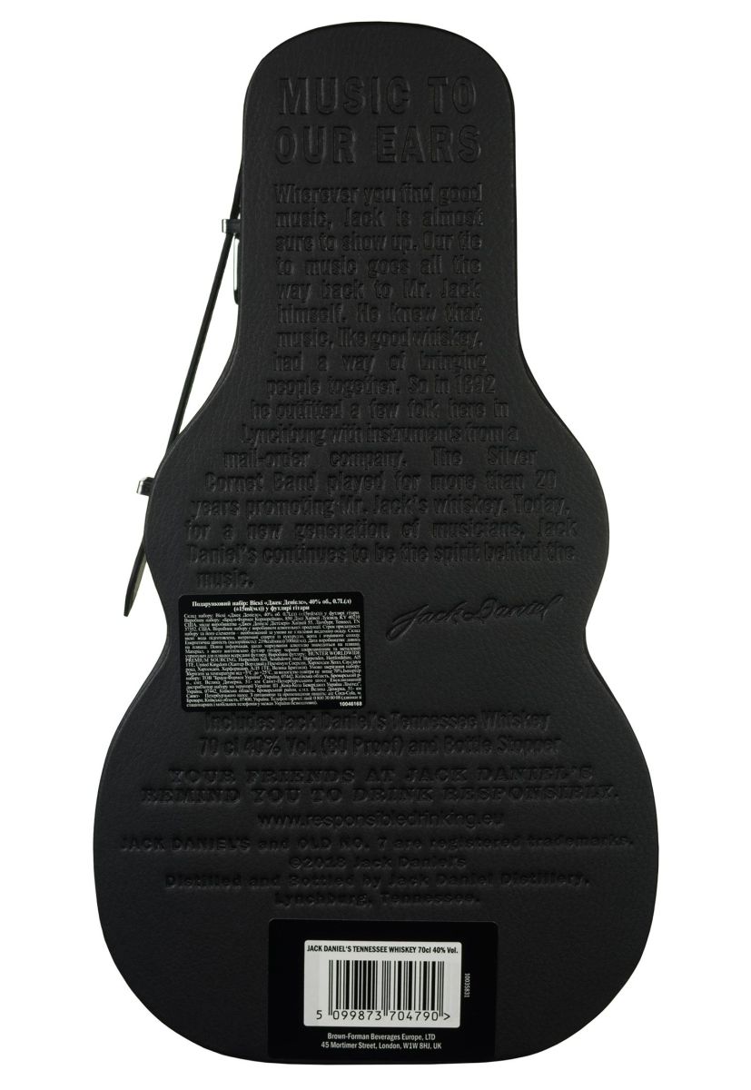 🔸 Особенности: Фильтрация через уголь сахарного клёна, выдержка 4–7 лет в обожжённых бочках из американского дуба, цвет золотисто-янтарный, футляр из искусственной кожи в форме гитары. Подходит для употребления в чистом виде, со льдом, с колой или в коктейлях. Хранить при температуре 5–25°C, вдали от прямых солнечных лучей. Напиток продаётся в более чем 170 странах и ассоциируется с американской культурой.